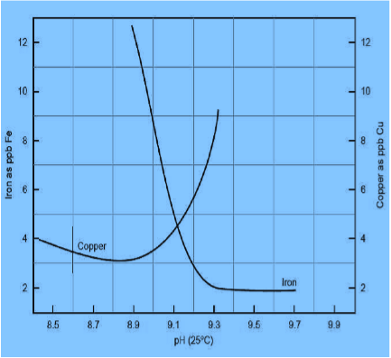 Kun järjestelmässä on sekä rautaa että kuparia, tulee olosuhteiden hallinta entistäkin kriittisemmäksi. Alueella pH >8,9 raudan korroosio hidastuu pH:n noustessa, mutta kuparin kiihtyy (kuva 1). Valitsemalla kemikaalit oikein on kuitenkin mahdollista nostaa pH alueelle pH 9,3 ja suojella kumpaakin metallia.