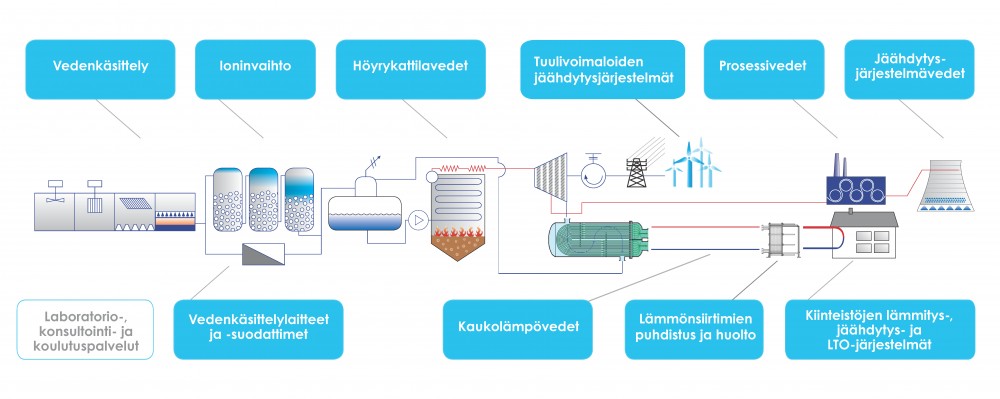 Palvelemme asiakkaitamme muun muassa lisäveden valmistuksessa, veden esikäsittelyssä sekä höyryntuotannon ja -käytön eri vaiheissa. Kaukolämpölaitoksille tarjoamme kokonaisratkaisuja, jotka sisältävät vedenkäsittelykemikaaleja ja -laitteita.