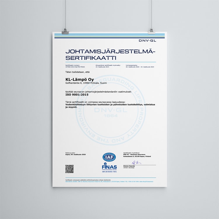 KL-Lämpö Oy:n laatujärjestelmä ISO 9001 uudelleenarviointi järjestettiin huhtikuussa 2020.