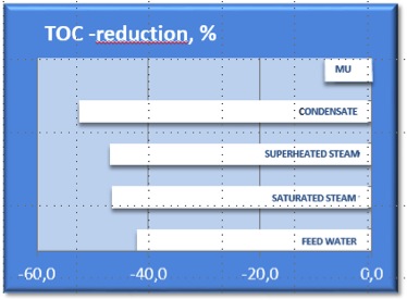 1. The superheated steam organics were reduced; TOC 0,78 → 0,39 mg/l.