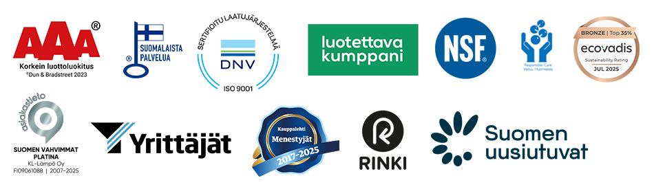 KL-Lämmölle on myönnetty EcoVadis-pronssimitali tunnustuksena hyvästä tuloksesta vastuullisuusarvioinnissa, jossa arvioitiin toimintamme sosiaalista, taloudellista ja ympäristövastuullisuutta. Lisäksi olemme mukana vapaaehtoisessa Responsible Care -vastuullisuusohjelmassa. Suomalainen työ ry on myöntänyt yrityksellemme Avainlippu-tunnukset osoituksena Suomessa tuotetuille ja Suomessa työllistäville palveluille ja tuotteille.
